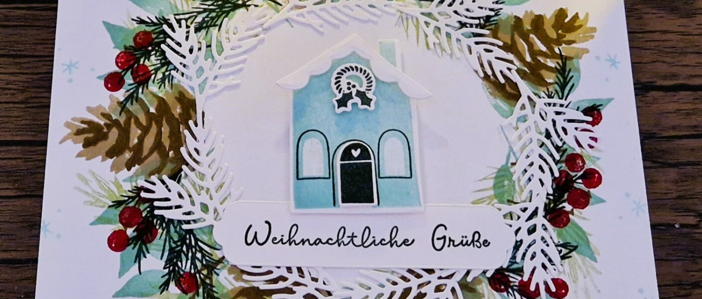 Gestaltet habe ich einen Kranz, in dessen Mittelpunkt ich ein kleines Häuschen gesetzt habe.