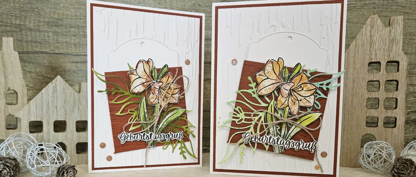 Das Produktpaket „Aufmerksame Amayryllis“ ist ja eigentlich eher für Winter und Weihnachten gedacht, da wir die Pflanze immer mit Weihnachten verbinden. Aber ich habe diese einfach mal in ein herbstliches Gewand gebracht – und ja, der Herbst steht quasi vor der Tür. Entstanden ist dabei diese Grußkarte: