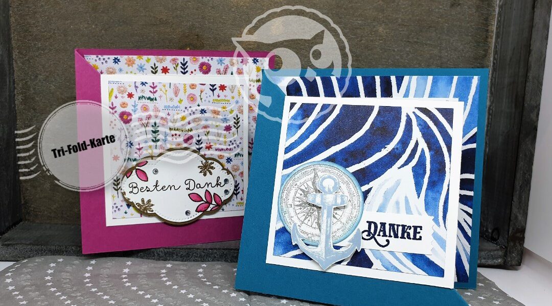 ich bin immer noch im Kartenwahn und deswegen habe ich heute eine besondere Kartenform für euch. Bei unserem Teamtreffen Anfang Juli 2019 haben wir nach einer Idee von der lieben Birgit eine Tri-Fold-Karte gebastelt.