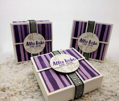 Die Banderole habe ich noch mit einem Stück des glitzernden Organdy-Bandes in schwarz verziert. Für den Kreis auf der Banderrole habe ich mich für die Handstanze 1 1/2 Kreis entschieden. Gestempelt habe ich den Hintergrund in Granit, wobei ich erst den zweiten Stempelabdruck verwendet habe. Der Spruch ist mit Amethyst gestempelt.