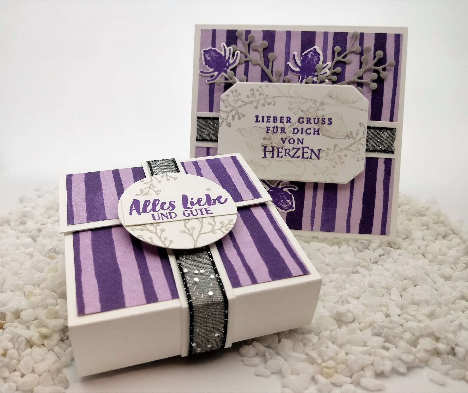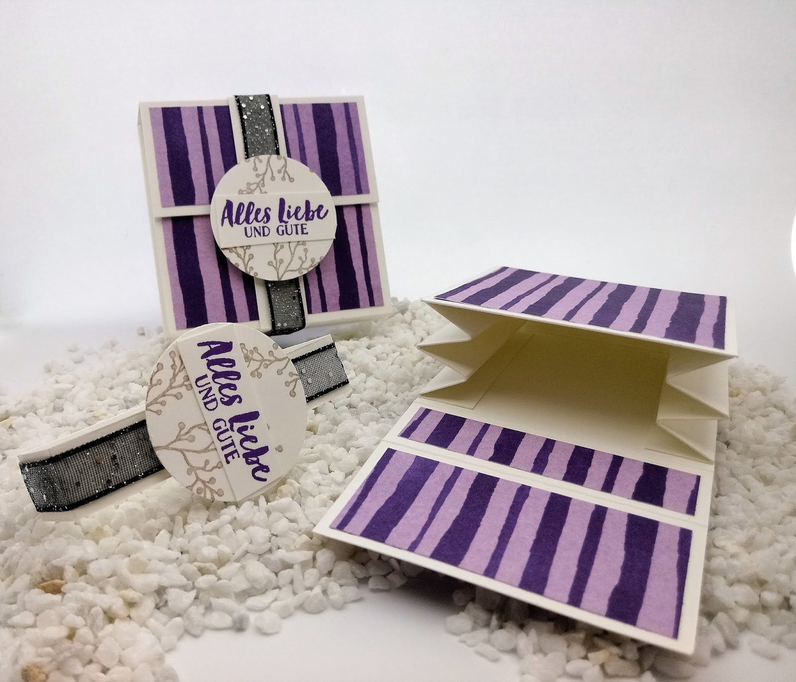 Die Banderole habe ich noch mit einem Stück des glitzernden Organdy-Bandes in schwarz verziert. Für den Kreis auf der Banderrole habe ich mich für die Handstanze 1 1/2 Kreis entschieden. Gestempelt habe ich den Hintergrund in Granit, wobei ich erst den zweiten Stempelabdruck verwendet habe. Der Spruch ist mit Amethyst gestempelt.