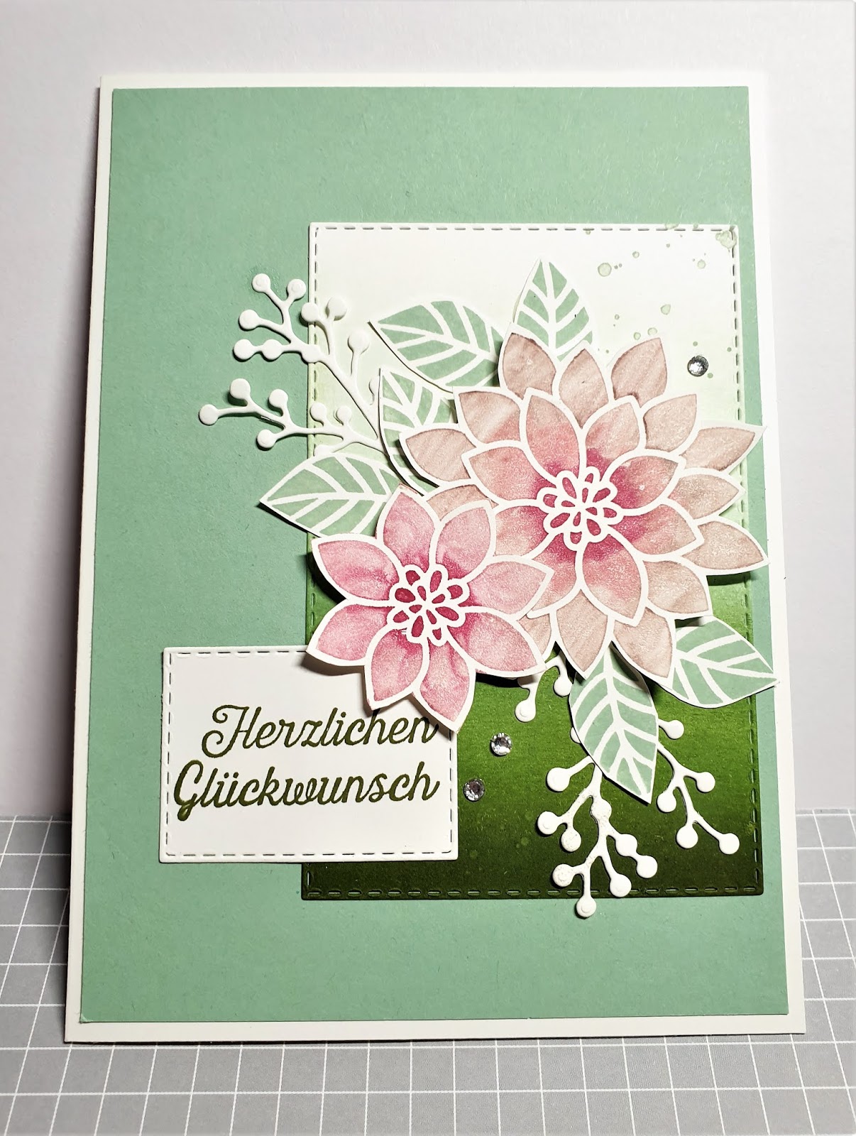 Als erstes ist natürlich bei mir eine Grußkarte entstanden. Gearbeitet habe ich mit dem Stempelset „Blühende Worte“