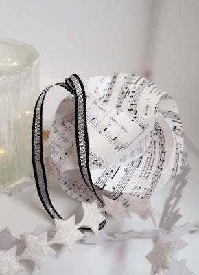 Jetzt müsst ihr nur noch die runden Falzlinien wieder einknicken und nach und nach entsteht die Kugel. Bevor ihr die letzte Lasche verschließt, einfach mit einem Pickser ein Loch ein stechen und das Band durchfädeln. Dann könnt ihr auch diese Lasche verschließen.