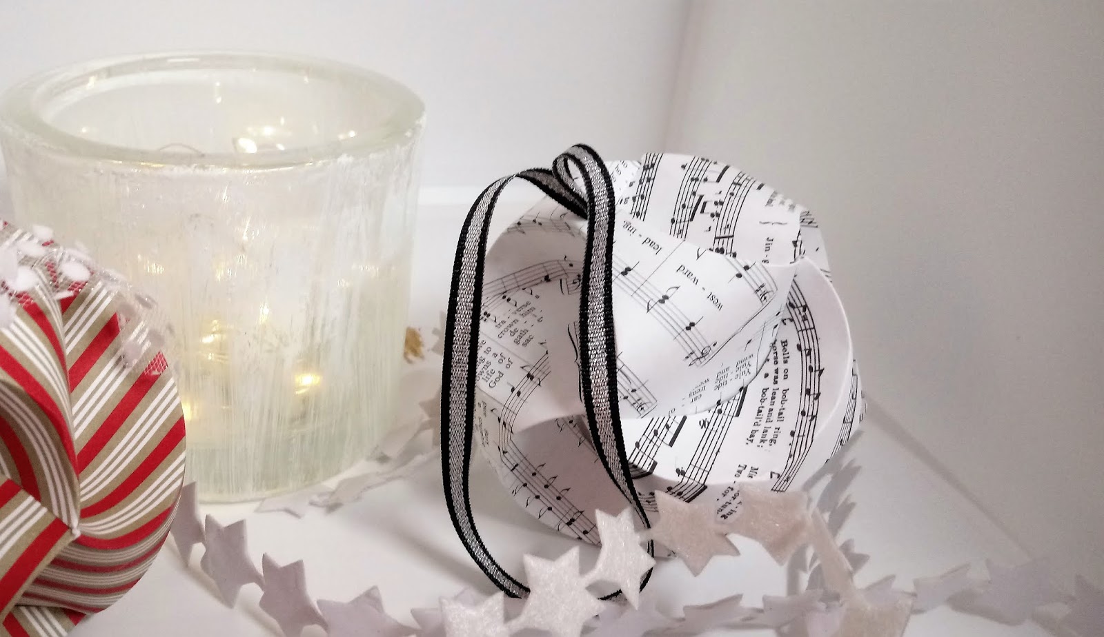 Jetzt müsst ihr nur noch die runden Falzlinien wieder einknicken und nach und nach entsteht die Kugel. Bevor ihr die letzte Lasche verschließt, einfach mit einem Pickser ein Loch ein stechen und das Band durchfädeln. Dann könnt ihr auch diese Lasche verschließen.