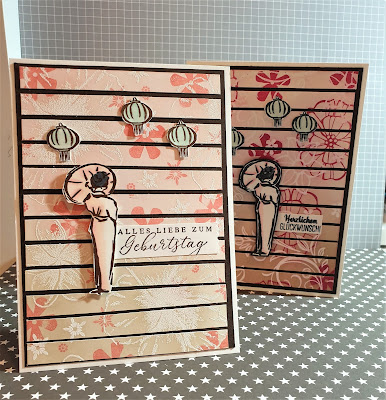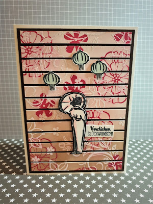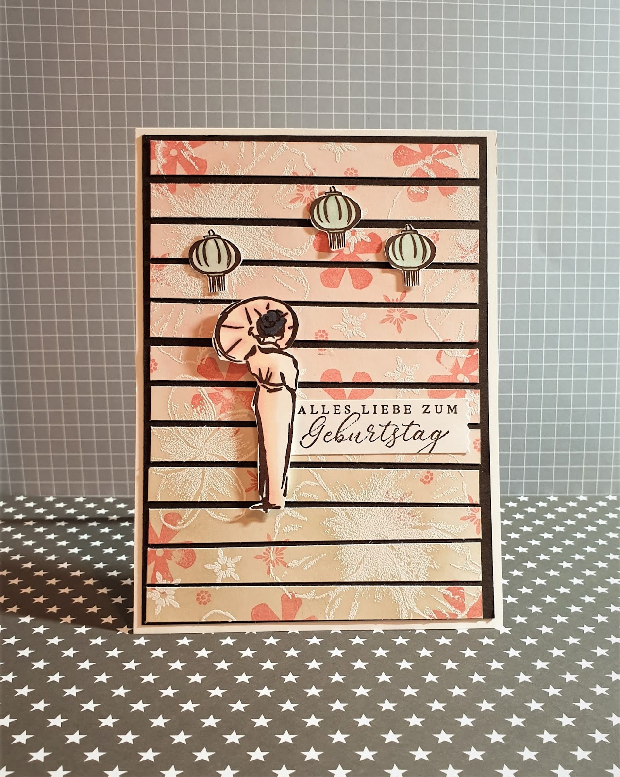 Nachdem ich alles mit Abstand auf die Mattung geklebt habe, habe ich noch die wunderbare Dame zusammen mit den kleinen Laternen als Akzente aus die Karte geklebt. Einen hübschen Spruch dazu und fertig ist eine sanfte, aber frische Karte mit Oho & Aha…