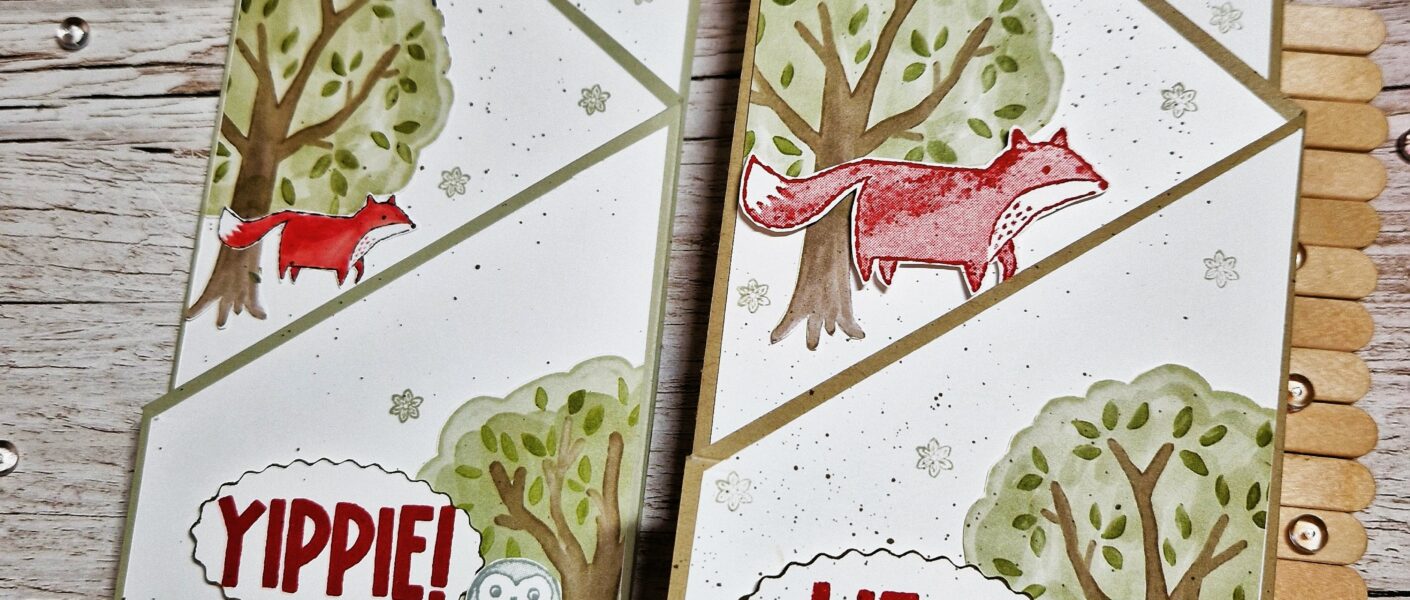 Weil mir die Idee der Kaskaden-Karte gefällt, habe ich heute für euch die einfache Version. Dabei habe ich mit dem Stempelset – Waldfreunde und dem dazugehörigen Designerpapier – Fröhlicher Wald gespielt.