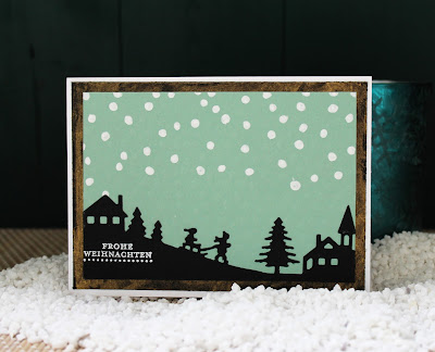 Die letzte Karte gefällt meinem Mann ganz besonders. Hierfür habe ich ein Edgelits im winterlichen Design (ähnlich den Edgelits-Formen aus dem Set „Weihnachten daheim – HWK, S. 39) in schwarz ausgestanzt. Die Front in Minzmakrone ist mit der Prägeform Punkteregen geprägt. Einige Punkte habe ich mit den weißen Kreidemarken (JK, S. 200) coloriert, damit es wie Schneefall aussieht. Der Spruch Frohe Weihnachten ist nochmal aus dem Set „Kleine Wünsche“. Diesen habe ich in weiß auf den schwarzen Farbkarton embosst.