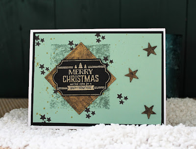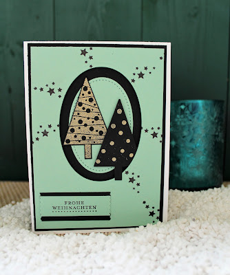 Bei Weihnachtskarten ist es für mich immer schwierig mich auf ein Stempelset zu konzentrieren, weil ich einfach auch gerne verschiedene Sets miteinander kombiniere. Bei dieser Karte habe ich mit den Framelits „Stickmuster“ (JK, S. 214) ein Quadrat ausgestanzt. Den schwarzen Farbkarton habe ich vorher mit goldener Glitzerfarbe bemalt. Den Hintergrund der Karte habe ich mit der Stempelblock-Technik und der Farbe Minzmakrone gestaltet. Die kleinen Sterne sind aus dem Set „Kurz gefasst“ (JK, S. 43). Die großen Sterne sind aus dem Rest des goldenen Farbkartons und der Minihandstanze ausgestanzt. Den Gruß habe ich mit gold auf schwarz embosst und hierfür das Stempelset „Labels to Love“ (Herbst/Winter Katalog, S. 45 und mit der Handstanze „Etikett für jede Gelegenheit“ (HWK, S. 12) ausgestanzt. Dieses habe ich dann mit den Dimensionals (JK, S. 203) auf das goldene Quadrat geklebt.