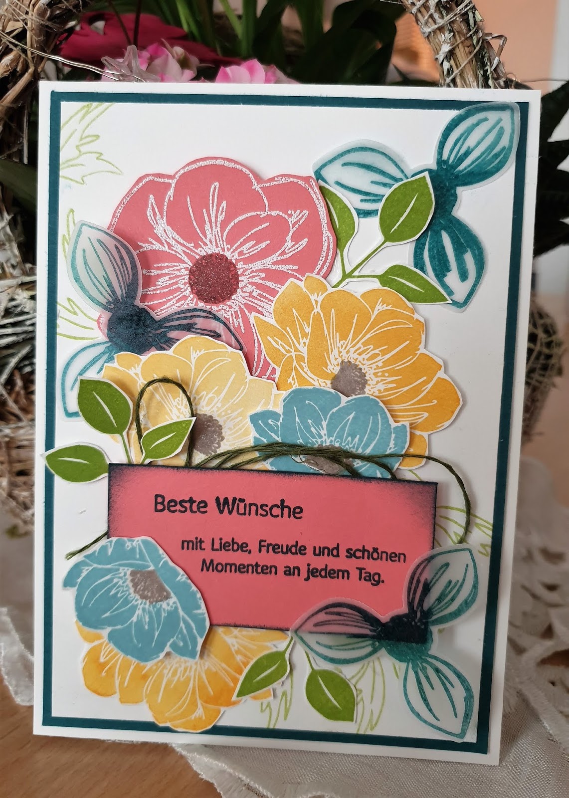 Als kleines Highlight auf der Karte habe ich mich dazu entschieden, die „Propeller-Blume“ auf Pergamentpapier in Pfauengrün zu stempeln und mit der Handstanze auszustanzen. Ein bisschen Leinenfaden in Waldmoos runden die Karte schön ab.