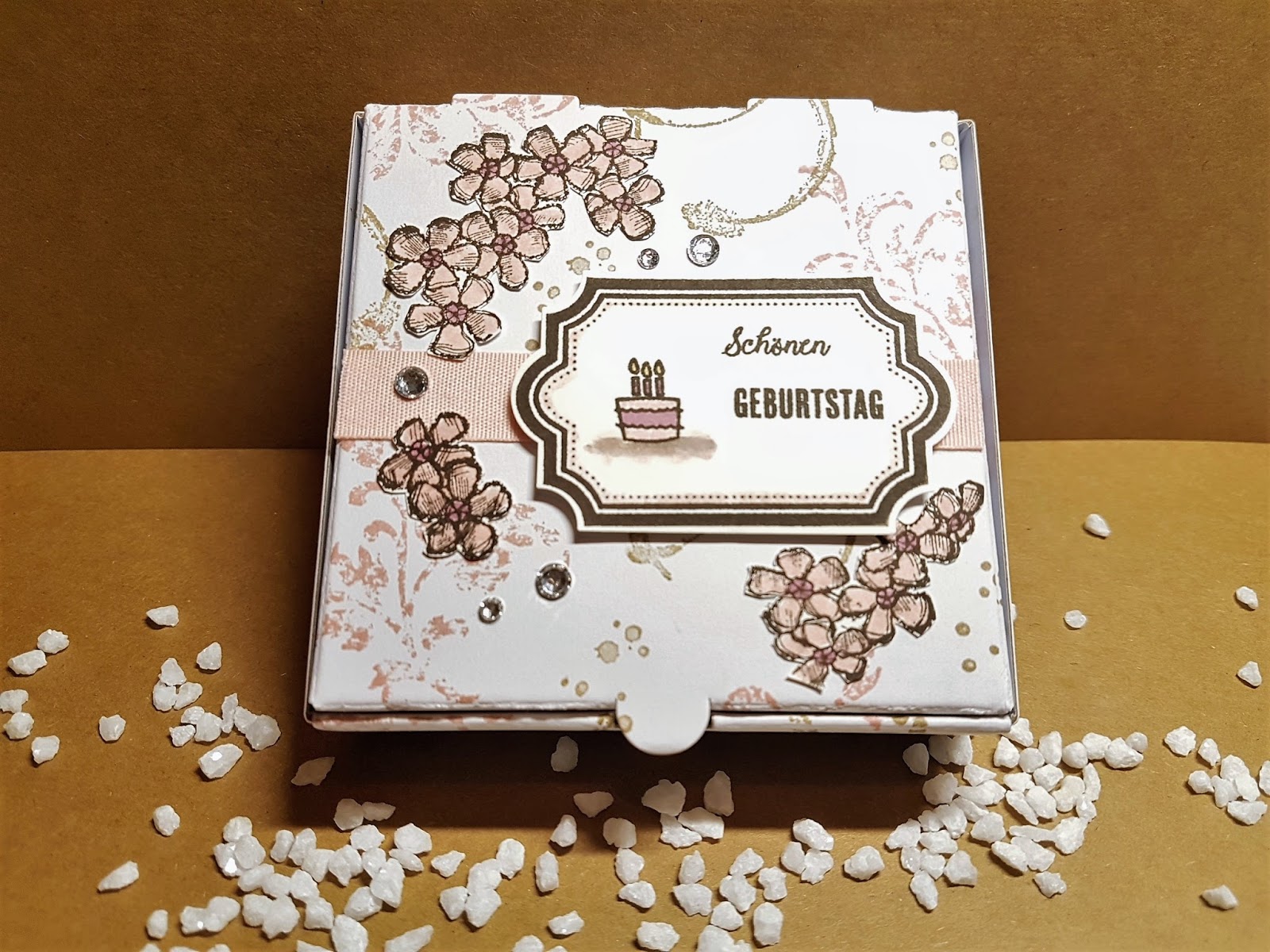 Heute habe ich mit den neuen Pizzaschachteln (HWK, S. 44) gespielt. Entstanden ist eine kleine Überraschung zum Geburtstag für eine liebe Kollegin.