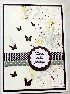 Bei der unteren Karte habe ich das Stempelset Angebracht (Frü/SoKatalog, S. 23) zusammen mit den Framelits für die Schmetterlinge verwendet. Ein bisschen Washitape aufgeklebt und den Hintergrund mit dem Stempelset Gorgeous Groung (JK, S. 123), welches uns leider verlässt, gestempelt.