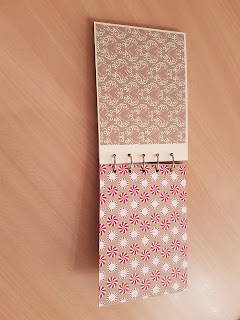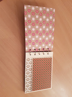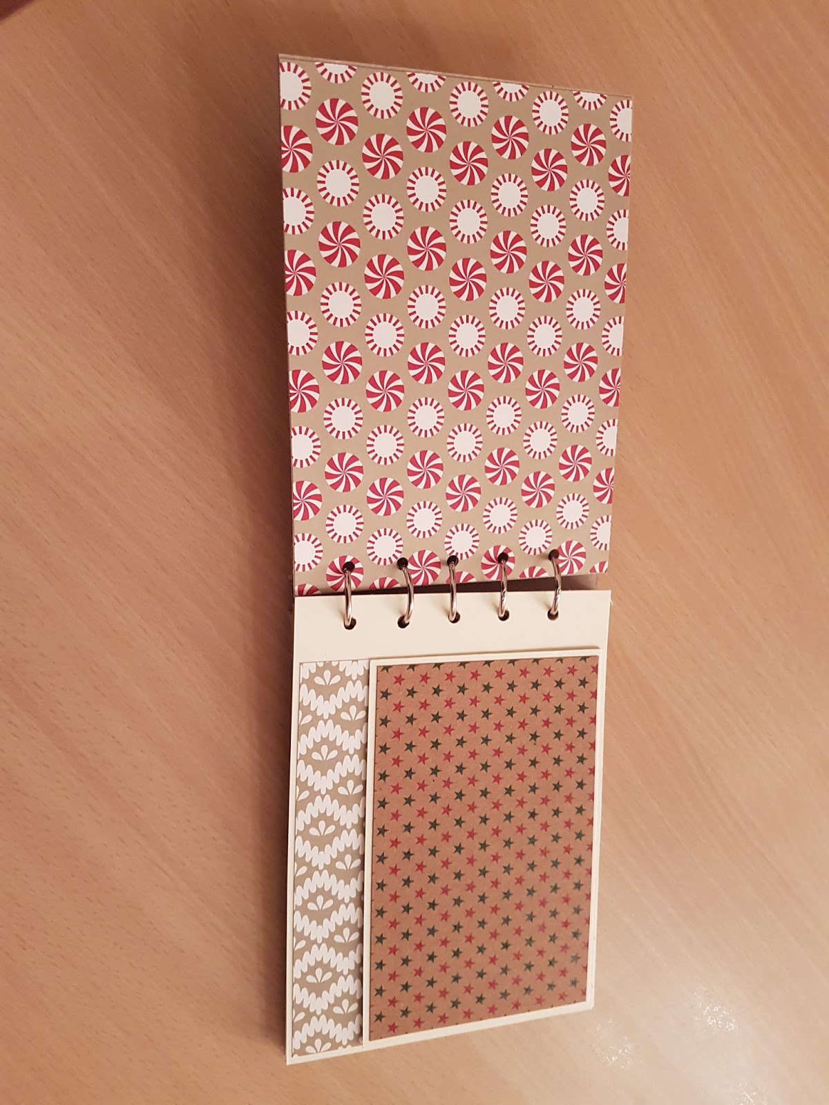 Das Minialbum hat die Maße 17,0 cm x 12,5 cm. Verwendet habe ich Reste von dem Designerpapier Zuckerstangenzauber aus dem Herbst/Winterkatalog von Stampin`Up!, sowie ein Designerpapier, bei welchem ich tatsächlich nicht mehr weiß, woher ich es habe. Ja, typisch Bastler – irgendwo unterwegs gewesen und herrlichen Designerpapier gesehen und mitgenommen.