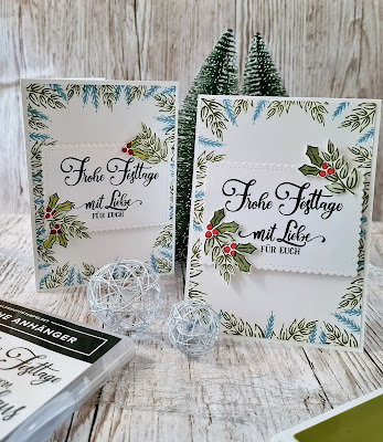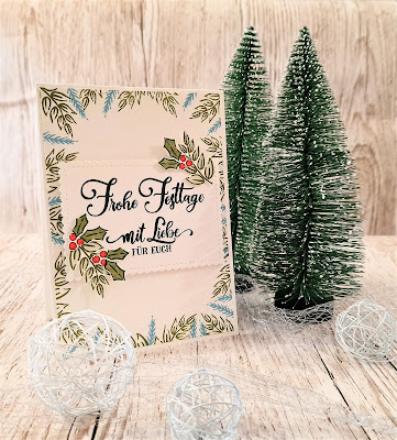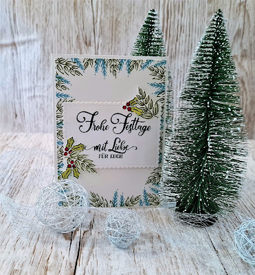 Ich mag die Karte, die mal etwas anders gestaltet ist, aber so einen Rahmen auf eine Karte zu stempeln, finde ich immer wieder schön festlich.