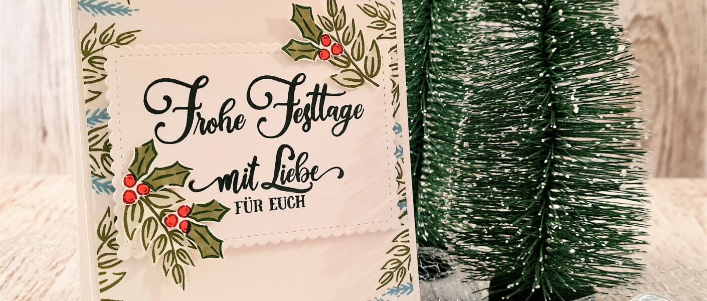 Ich habe mich bei dieser Karte für das Stempelset „Festliche Anhänger“ entschieden. Grundsätzlich kann man mit dem Set wunderbare Anhänger für Geschenke gestalten, aber natürlich lassen sich die Stempel auch wunderbar für eine weihnachtliche Grußkarte verwenden.