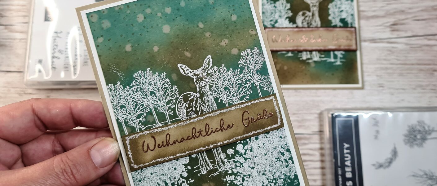 Ich habe mich bei dieser Karte für das Stempelset „Nature´s Beauty“ entschieden, weil es Zeit wurde in den Winterwald zu stapfen. Und es wird embosst – Jippi!