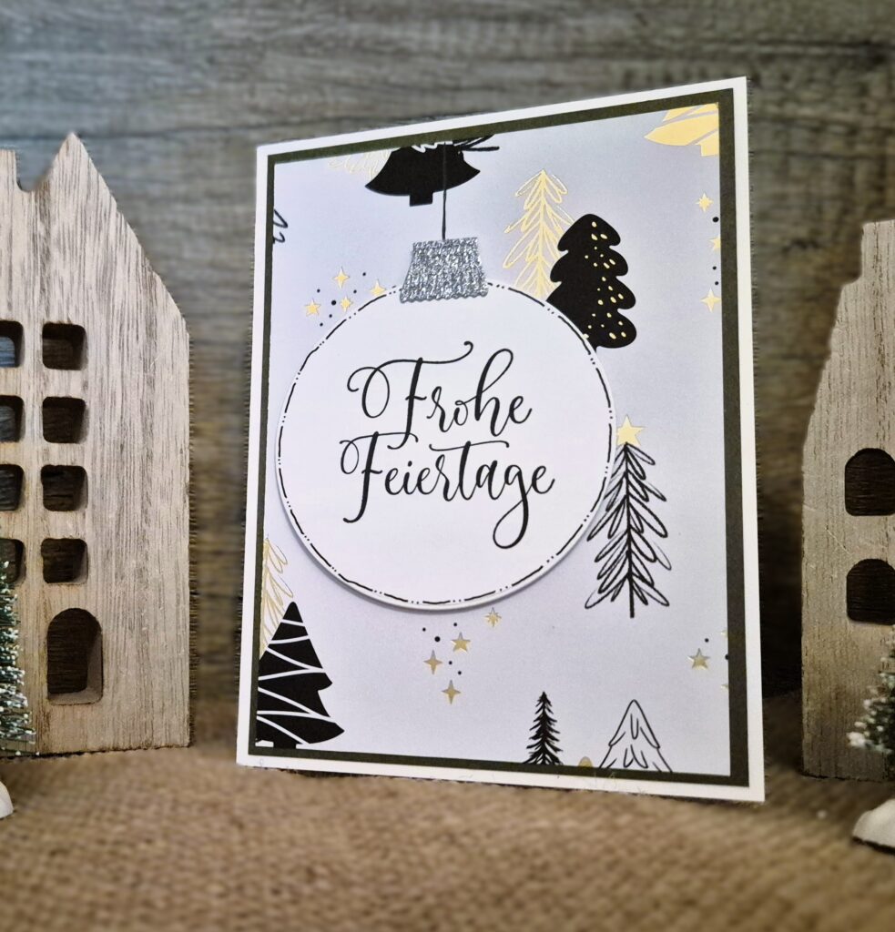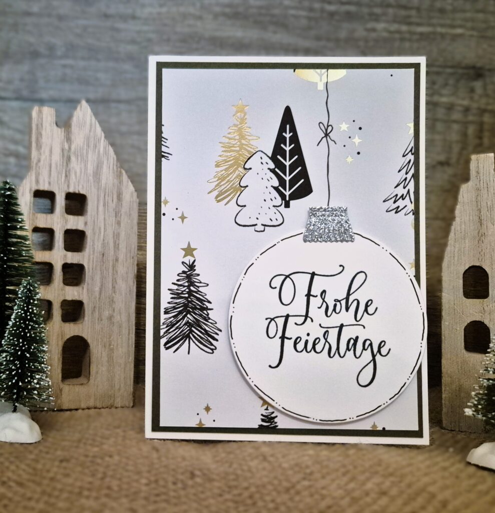 Diese Karte ist schlicht und einfach und absolut geeignet, wenn man viele Weihnachtskarten benötigt. Als Bonus verbraucht man Designerpapier – ich habe das zum Set passende Designerpapier „Schmuckvolle Weihnachten“ verwendet.