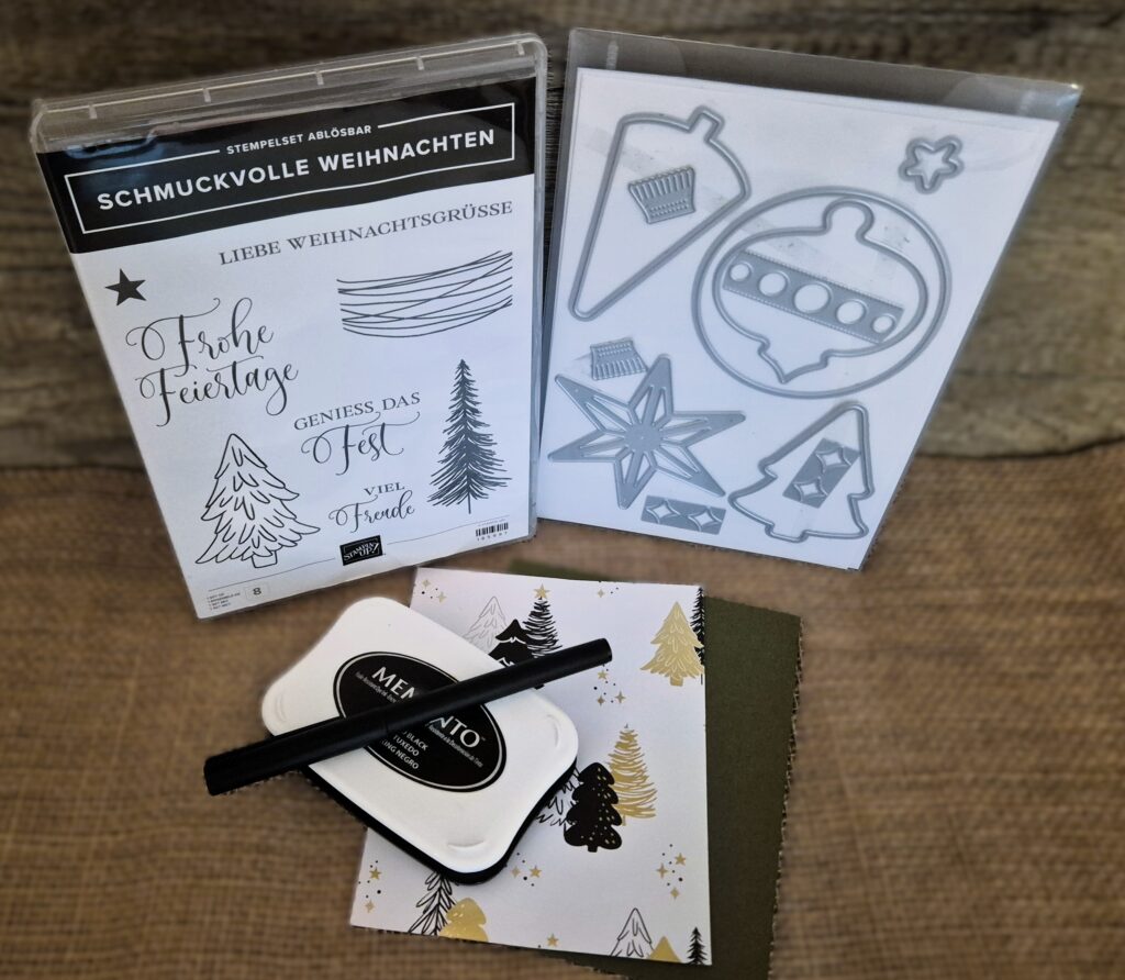 Ich habe mich bei dieser Karte für das Produktpaket „Schmuckvolle Weihnachten“ entschieden, welches ihr sehr gerne in meinem Online-Shop von Stampin`Up! entdecken und bestellen könnt – klick