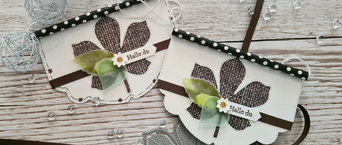 Ich habe die Stanzform einmal mit Farbkarton Flüsterweiß und einmal mit Designerpapier „Ganz mein Geschmack“ ausgestanzt und einfach in der Mitte halbiert. Bedeutet, pro Stanzform könnt ihr zwei Wimpel kreieren.