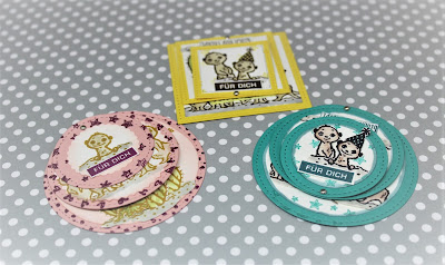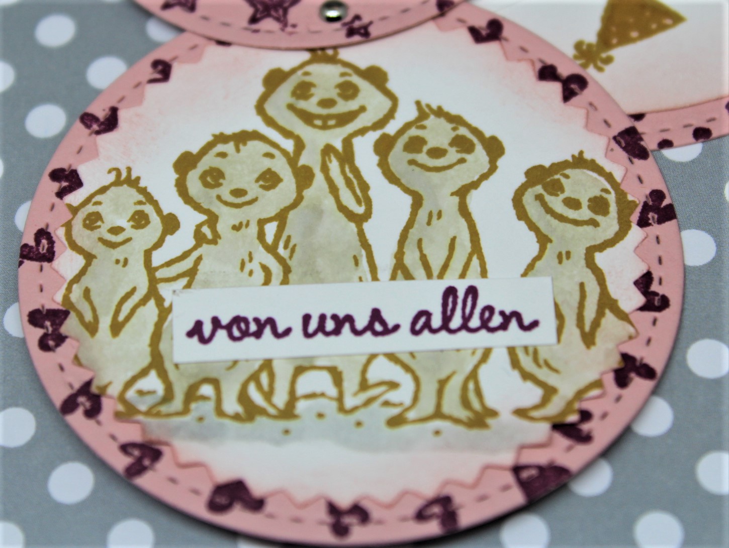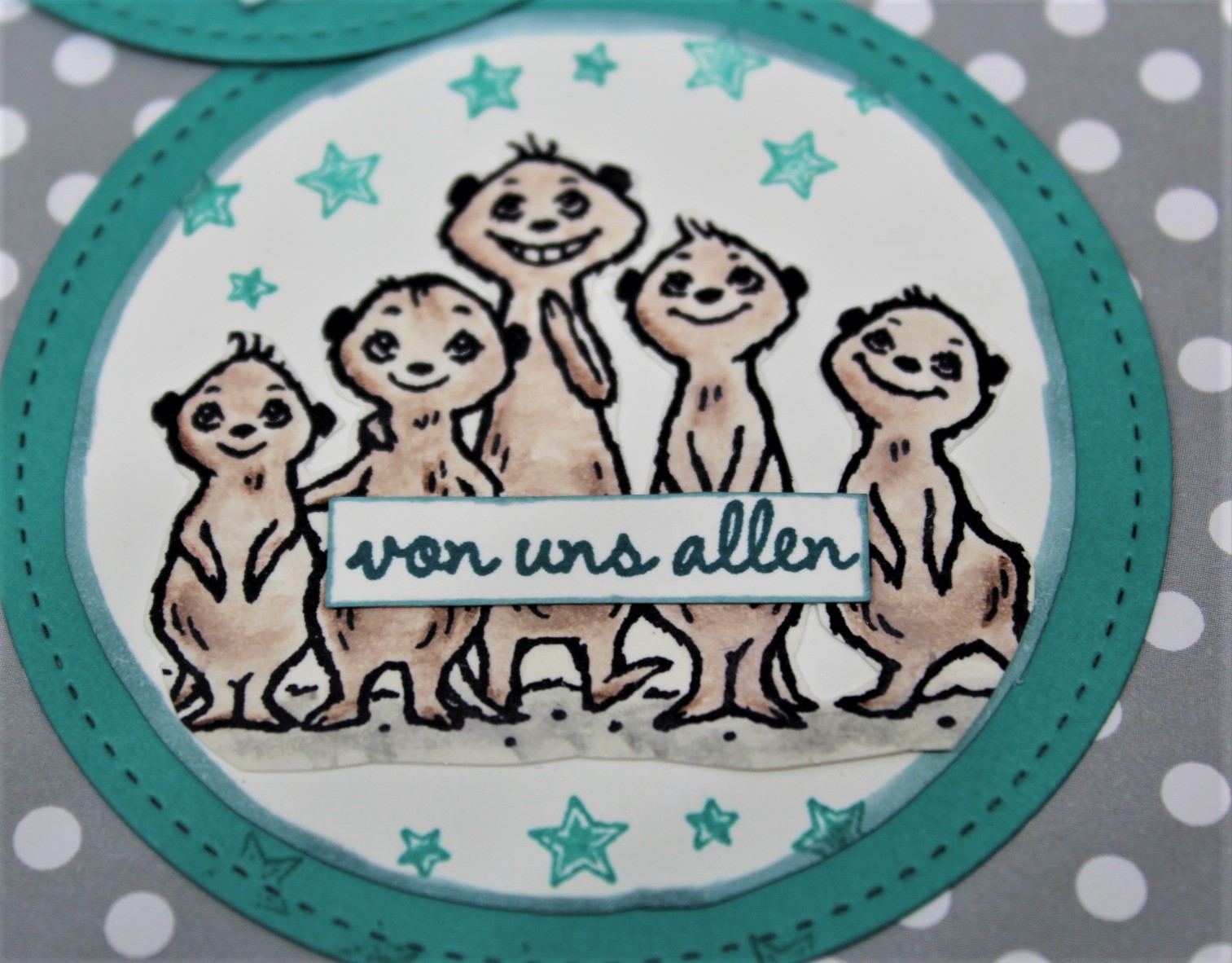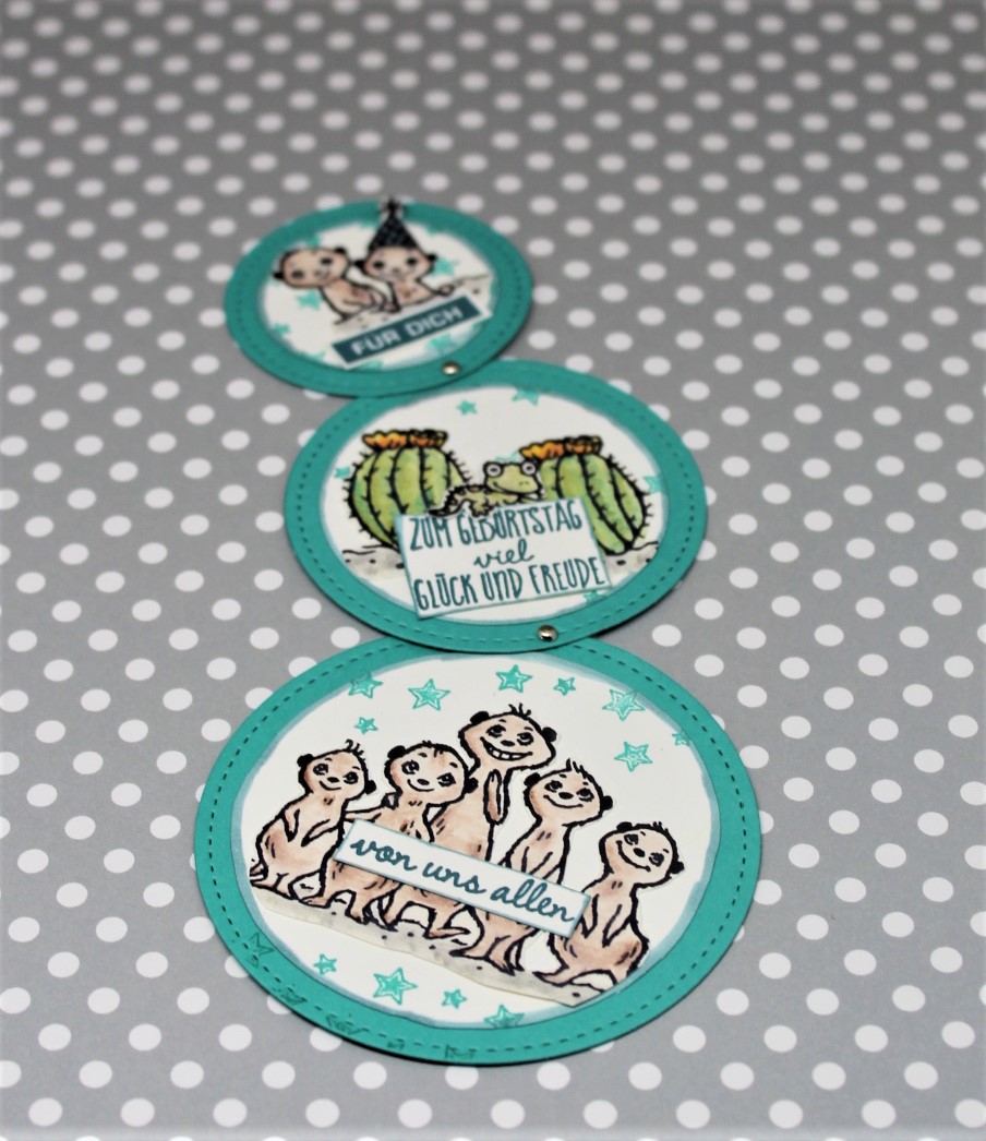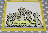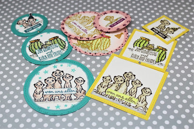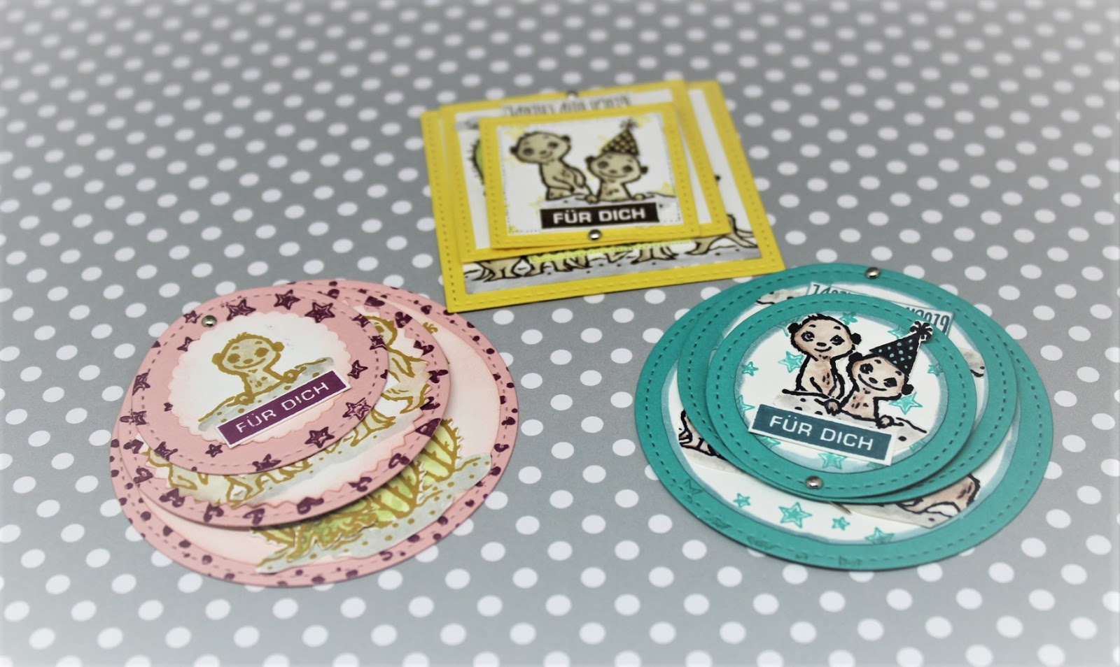 Die blaue Variante ist mit den Aquaraellstiften und dem Blenderpen auf Seidenglanzpapier coloriert. Die Erdmännchen in der Kirschblüten-Variation sind mit einem Wassertank-Stift und den verschiedenen Stempelkissen coloriert. Zum Schluss habe ich bei der gelben Varianten mit den Stampin`Blends coloriert.