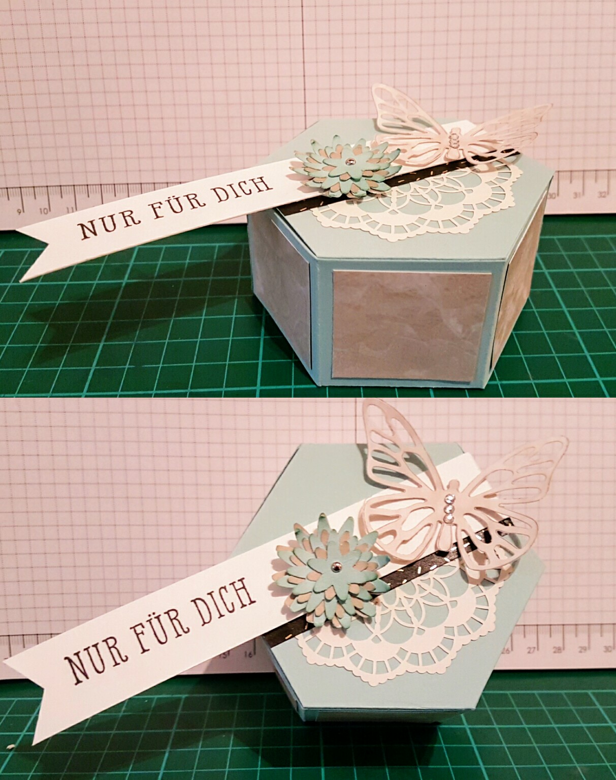Ich habe bei der Schachtel diesmal die Seiten mit dem Designerpapier „Zum Verlieben“ beklebt,