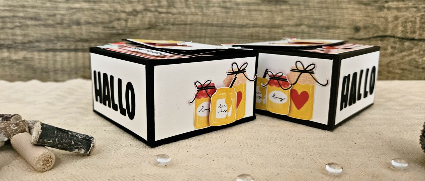 heute habe ich mal eine kleine, süße Box gewerkelt, die mit einem Magneten verschlossen wird. Das Designerpapier „Honigsüß“ hat ja auch so wunderbare Marmeladen- und Honiggläser, die man natürlich wunderbar ausschneiden kann.