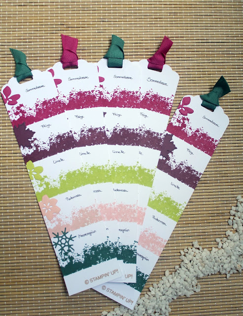Das Lesezeichen hat die Maße 20,5 x 5 cm. Die Stanze gewellter Anhänger (JK, S. 206) habe ich als obere Kante verwendet. Zum Schluss noch das neue Geschenkband (JK, S. 198) in Sommerbeere und Meeresgrün. Fertig sind die kleinen Colour Coaches.