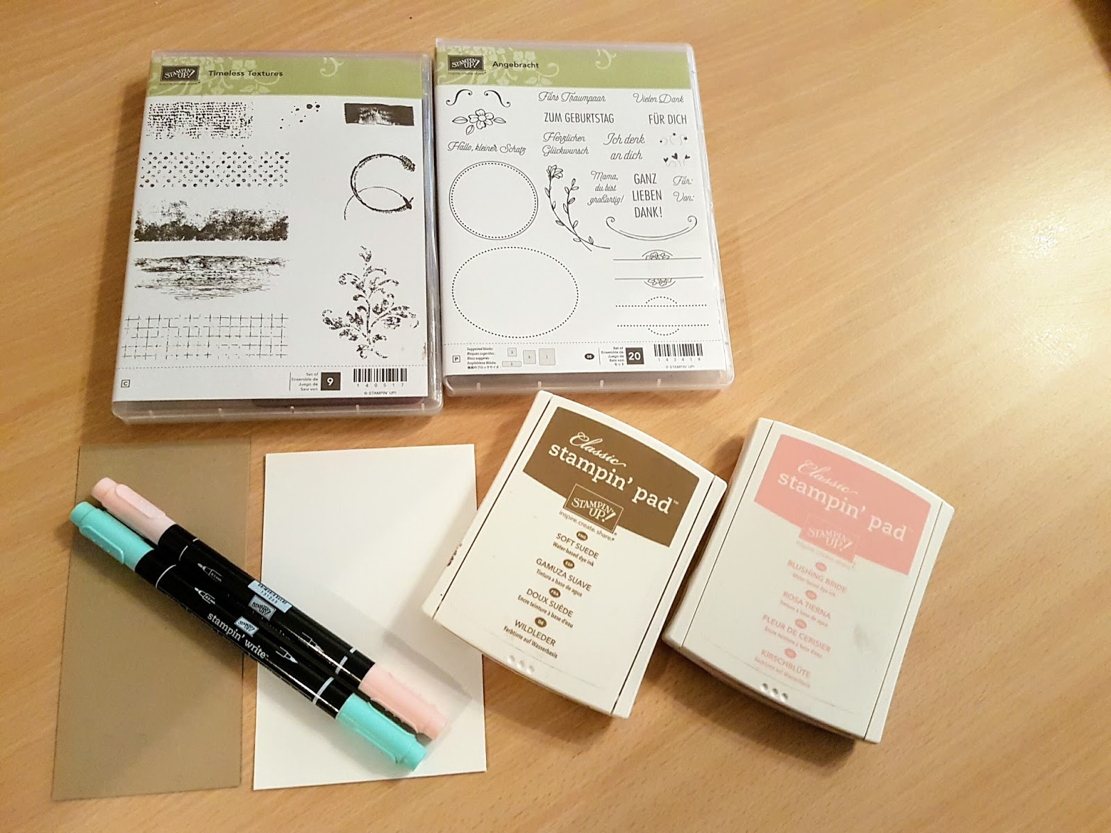 Farbkarton in Flüsterweiß und in Savanne, Stempelkissen in Wildleder und Kirschblüte, Stampin`Write Marker in Kirschblüte und Aquamarin, sowie das Stempelset „Angebracht“ aus dem neuen Frühjahr/Sommerkatalog und das Stempelset „Timeless Texture“ aus dem Jahreshauptkatalog.