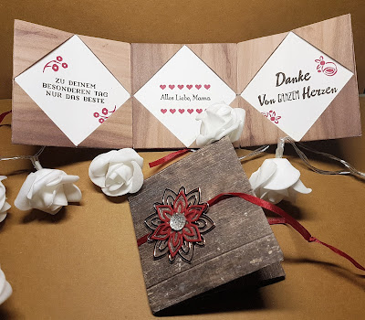 Ich habe das kleine Büchlein passend zum Muttertag gestaltet. Das Büchlein hat die Maße von 7,5 x 7,5 cm. Verwendet habe ich das Designerpapier „Holzdekor“, welches die Maße 6 Inch x 6 Inch bzw. 15,2 x 15,2 cm hat. Ihr benötigt das Designerpapier insgesamt dreimal.