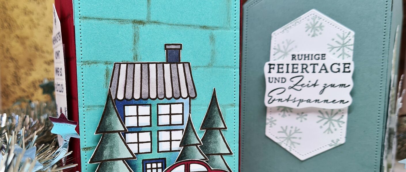 Im Häuschen ist eine kleine Verpackung verborgen, die man an einer Schleife nach oben ziehen und öffnen kann. Wie das Häuschen entstanden ist, könnt ihr euch gerne auf meinem YouTube Kanal anschauen – klick