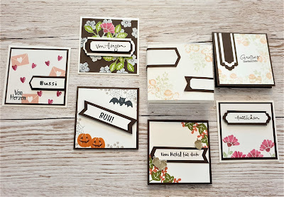 Natürlich habe ich ein kleines Kartenset gewerkelt, um die „Tags“ in Szene setzen zu können. Dafür habe ich als Grundkarte Farbkarton in Flüsterweiß und auch in Espresso in den Maßen von