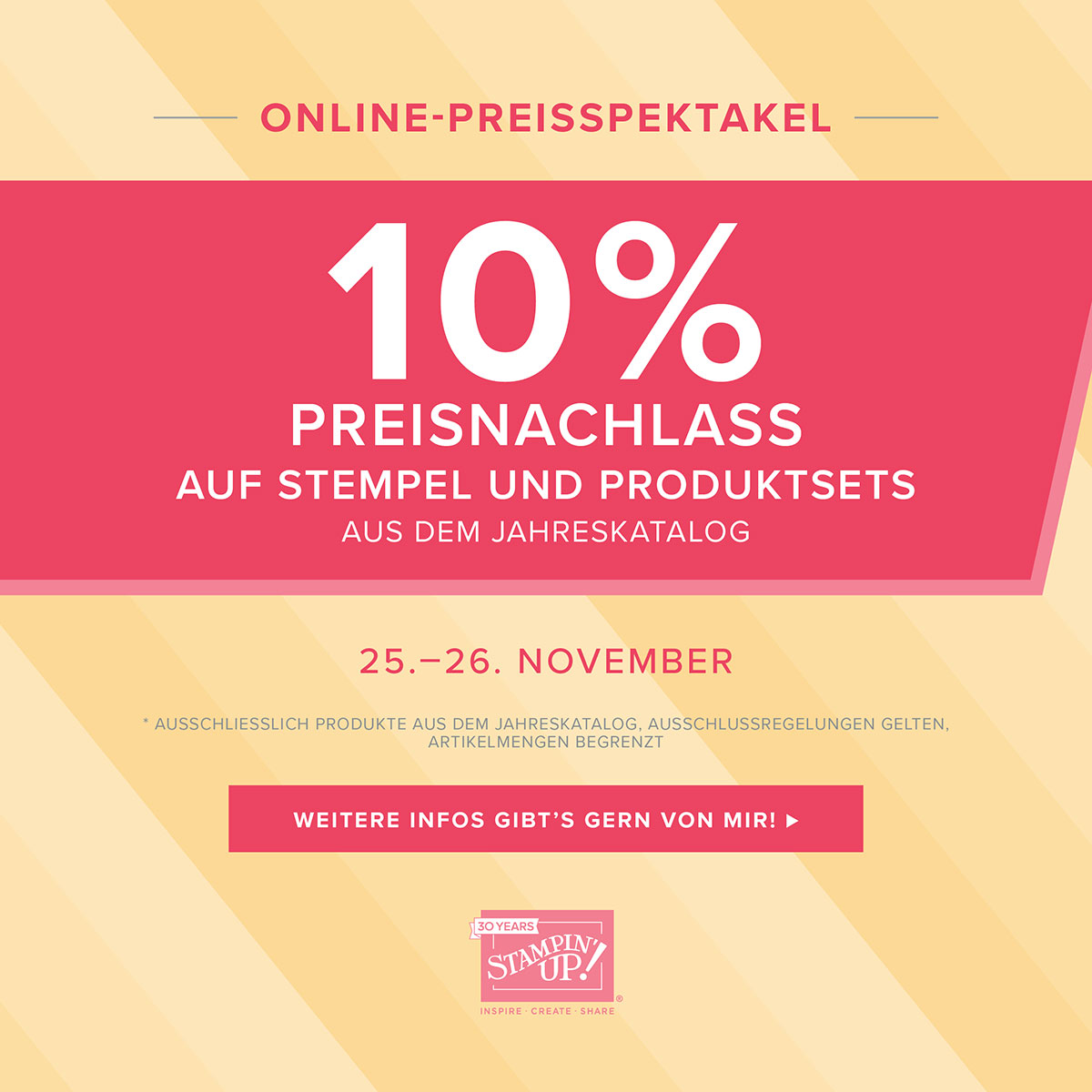 Am 25. und 26. November 2018 gibt es dann 10% Preisnachlass auf Stempel und Produktsets (Stempelsets, Projektsets, Kartensets, Nachfüllsets, Erinnerungen und Mehr, Stanz-Box-Sets)