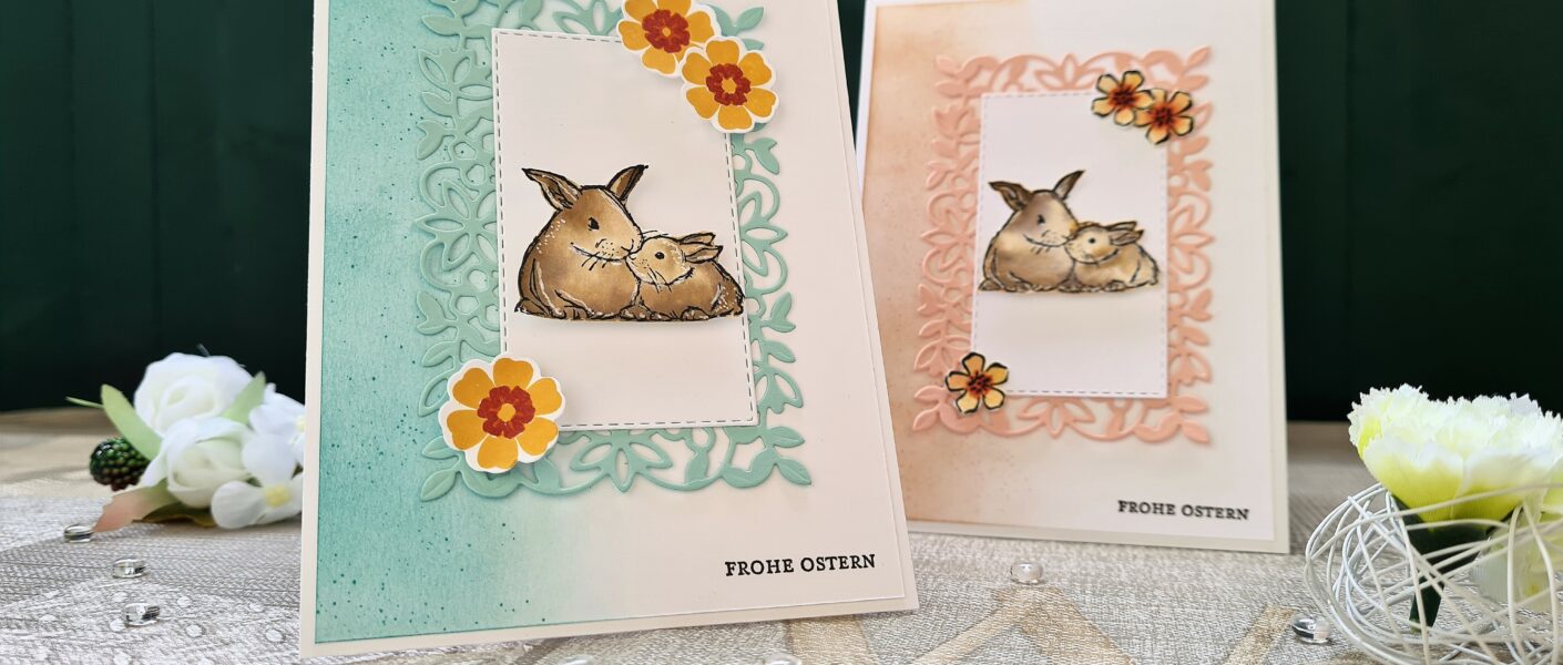 Ich habe bei den Karten, immer ein anderes Ornament in den Hintergrund gesetzt, damit man die verschiedenen Möglichkeiten der tollen Stanzformen sehen kann. Im Video ist die blaue Karte entstanden, um mal ein bisschen Farbabwechslung rein zu bringen. Coloriert habe ich die zwei hübschen Häschen in der Aquarelltechnik. Ich habe euch das im Video versucht, mal ein bisschen zu erklären. Hier kommt ihr zum Video: klick