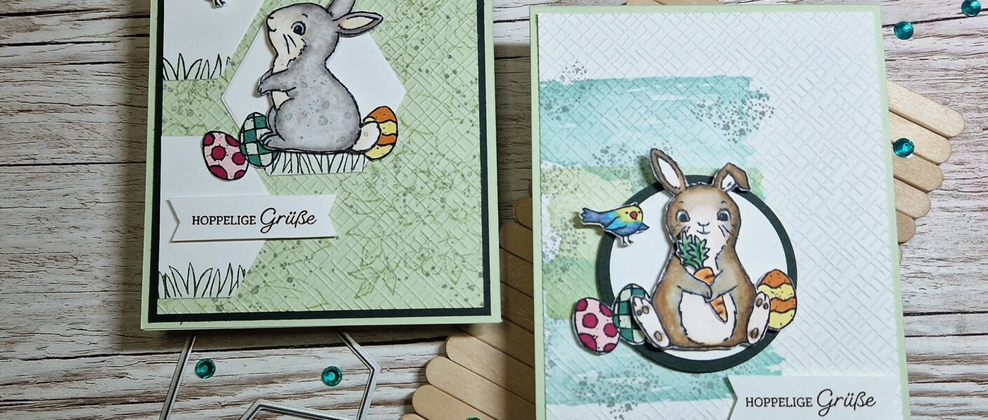 mir ist aufgefallen, dass ich noch gar nichts für Ostern gebastelt habe. Daher habe ich das Stempelset „Osterhase“ (auch als Produktpaket mit passender Handstanze erhältlich) genommen.