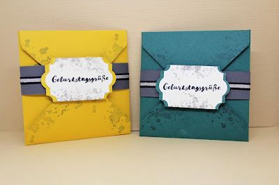 Die drei Aufleger in Flüsterweiß haben die Maße von 9,0 x 9,0 cm. Gestaltet habe ich diese mit dem Stempelset „Gorgeous Grounge“, dem Stempelset „Geburtstagsmix“, sowie dem Set „Kurz gefasst“.