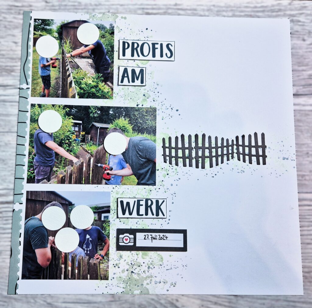 Heute ist ein Layout entstanden, bei der mein Mann, mein Sohn und ein Freund von uns unseren Zaun im Garten repariert haben. Weswegen ich den Titel „Profis am Werk“ gewählt habe. Wir hatten viel Spaß an diesem Tag und haben dann natürlich auch noch gegrillt und den Tag entspannt ausklingen lassen.