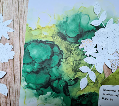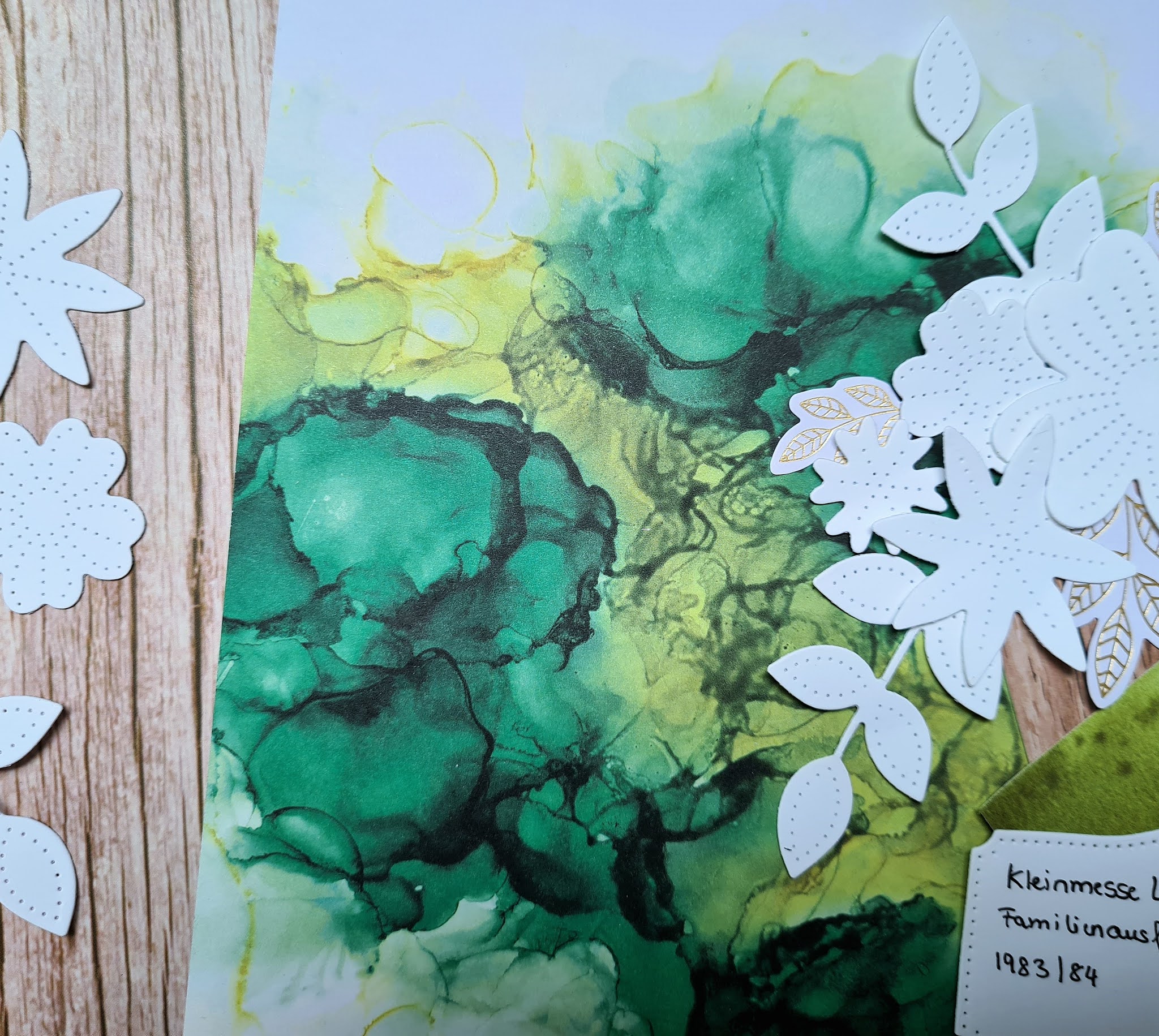 Bei dem Layout wollte ich unbedingt das tolle Designerpapier Tintenkunst verwenden und das komplett in Szene setzen. Zusammen mit ein paar anderen Designerpapieren und den Stanzformen „Perforierte Blumen“ ist dieses Layout irgendwie von alleine entstanden.