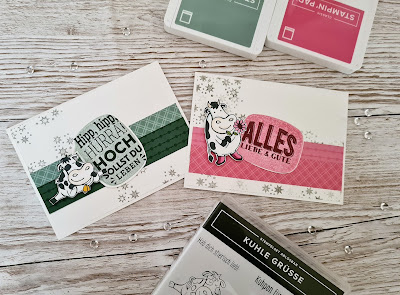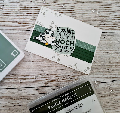 Bei meiner heutigen Kartenidee habe ich mich für das Stempelset „Kuhle Grüße“ zusammen mit dem Set „Fabelhaft“ entschieden, weil ich einfach schon immer auf Kühe stehe. Entstanden sind dabei diese beiden Karten: