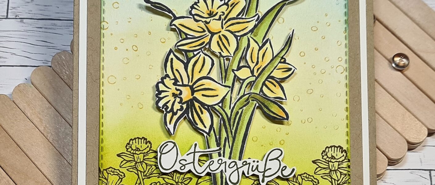 Im aktuellen Saisonkatalog von Stampin`Up gibt es ja das Stempelset „Daffodil Daydream“ das ja wieder wunderbare Osterglocken / Narzissen hat. und schwupps musste ich an eins meiner geliebten Stempelschätze denken, das Stempelset „You´re Inspiring“. Auch dieses Set hat wunderbare Narzissen / Osterglocken, die sich perfekt als Hintergrundmotiv geeignet haben.