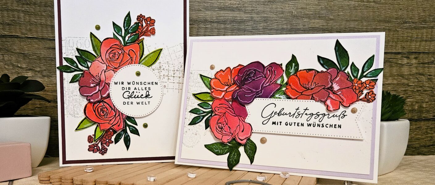 Jetzt, aber zu meiner sechsten Kartenidee, die diesmal ein farbenfroher Blumengruß ist:
