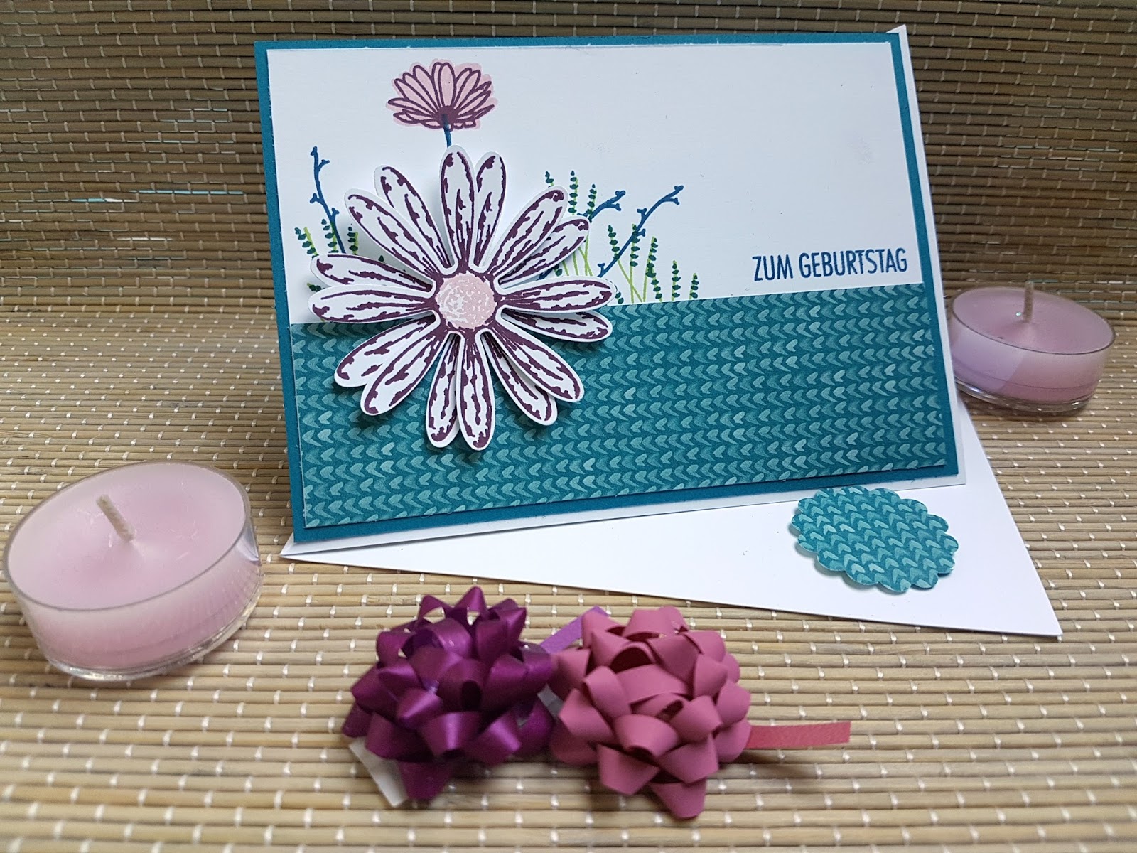 Für die Mattung habe ich ein Stück in Petrol in den Maßen 10,0 x 14,0 cm verwendet und ein Stück Flüsterweiß in den Maßen 9,5 x 13,5 cm. Das Stück Designerpapier ist in den Maßen 13,5 x  4,0 cm. Ein bisschen Farbkarton in Flüsterweiß für das Gänseblümchen und etwas Designerpapier für den Wellenkreis.