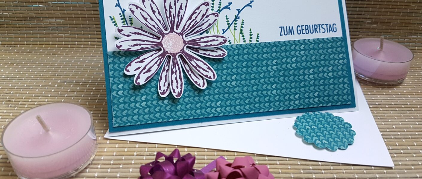 Für die Mattung habe ich ein Stück in Petrol in den Maßen 10,0 x 14,0 cm verwendet und ein Stück Flüsterweiß in den Maßen 9,5 x 13,5 cm. Das Stück Designerpapier ist in den Maßen 13,5 x 4,0 cm. Ein bisschen Farbkarton in Flüsterweiß für das Gänseblümchen und etwas Designerpapier für den Wellenkreis.