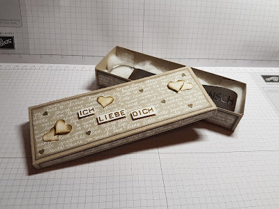 Ich habe die Box in Savanne gestaltet. Benutzt habe ich das Designerpapier im Block Neutralfarben (JK, S. 174). Da wir beide nicht die größten Romantiker sind habe ich statt blumiger Worte einfach die drei Worte geschrieben. Diese habe ich mit dem Stempelset “ Labeler Alphabet“ (JK, S. 156) auf ein Stück Flüsterweiß gestempelt, Hierbei hab ich jeden Buchstaben einzeln gestempelt, da mir sonst der Abstand zwischen den einzelnen Buchstaben zu groß ist. Jedes Wort hab ich dann einfach so mit der Schere ausgestanzt, ohne Stanze und freihand. Können wir Bastler ja auch.
