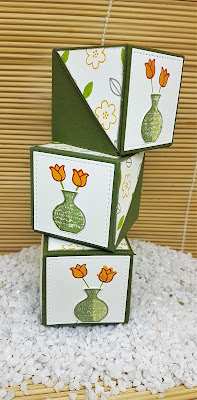Die Vase habe ich mit den Stamipn`Write Markern coloriert bzw. habe ich den Stempel zweifarbig eingefärbrt. Diese habe ich dann mit der passenden Handstanze ausgestanzt. Die Tulpen habe ich direkt auf das Stück Flüsterweiß gestempelt.