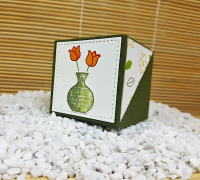 Dann habe ich mir mit der BigShot das zweitkleinste Quadrat in Flüsterweiß von den Framelits Stickmuster ausgestanzt. Dieses habe ich für die Front als Umrahmung für die Vase benutzt.