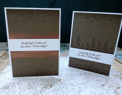 Die zweite Karte ist ähnlich – jedoch habe ich den Hintergrund mit dem Weihnachtsbäumchen aus dem Stempelset „Zauber von Weihnachten“ gestaltet.