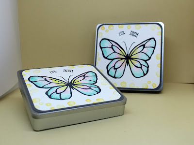 Das Stempelset „Wunderbarer Tag“ mit dem großen Schmetterling hat mir als optischer Hingucker und als Vorschau auf das Innenleben der Box super gut gefallen. Coloriert habe ich den Schmetterling mit den Aquarellstiften zusammen mit den Mischstiften. „Für Dich“ habe ich mir aus dem Stempelset „Gut gesagt“ gemopst, welches dann auch noch bei den Grußkarten zur Verwendung kommt. Zum Schluss habe ich den Schmetterling noch ein bisschen mit dem Wink of Stella – Glitzerstift beglitzert.