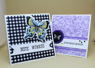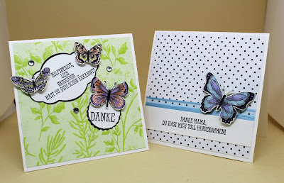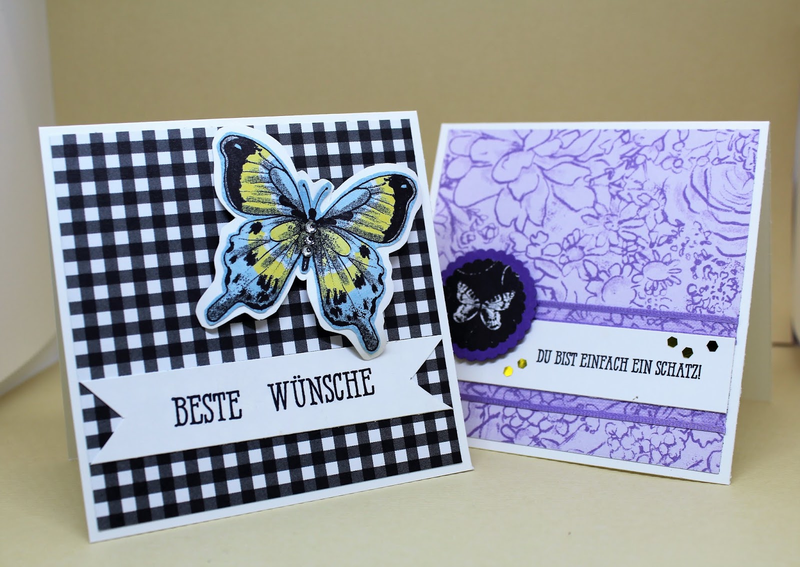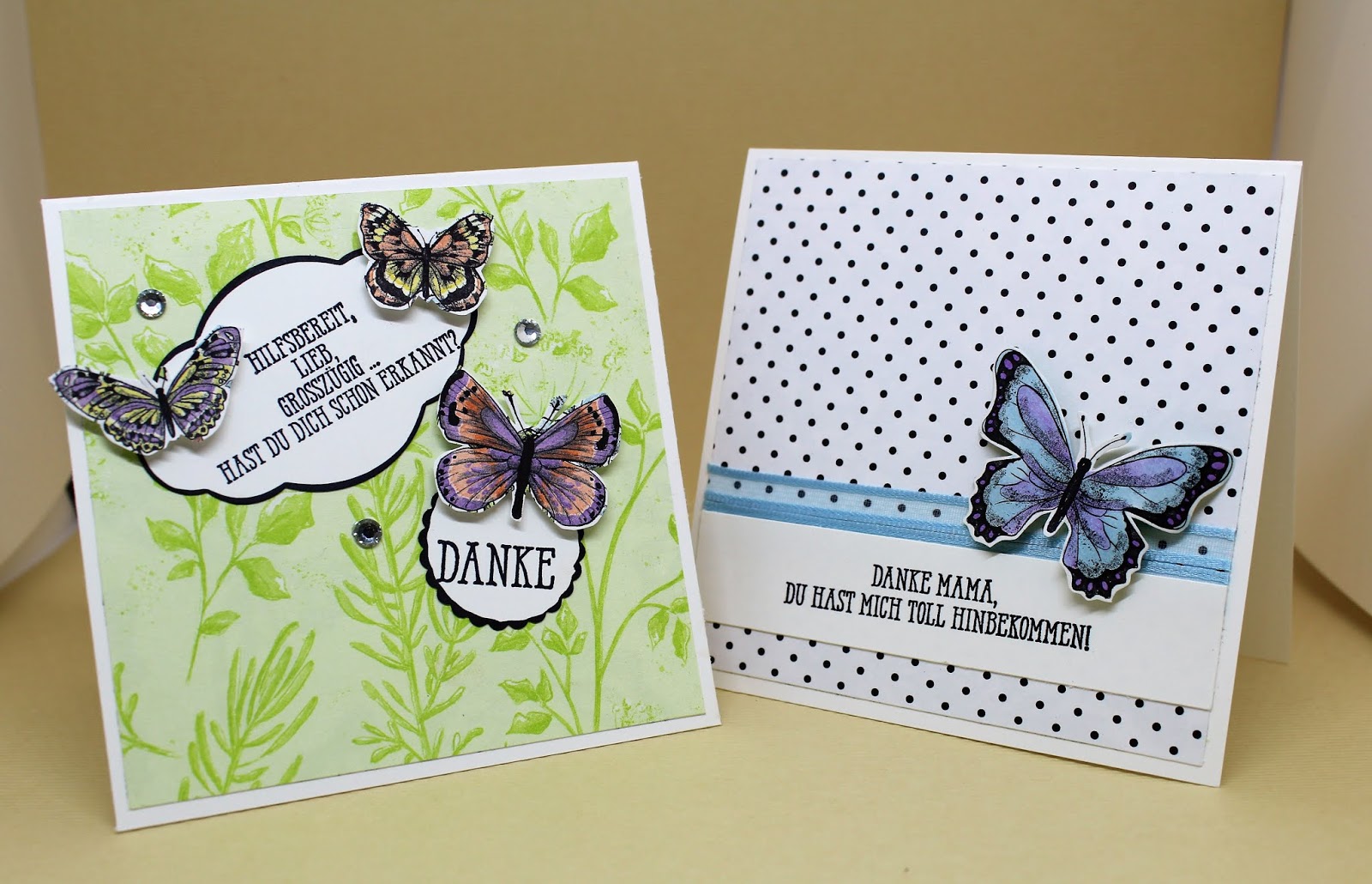 Für die Gestaltung der Karten habe ich mich für das zauberhafte Designerpapier „Schmetterlingsvielfalt“ aus der diesjährigen Sale-A-Bration-Broschüre entschieden. Die einzelnen Sprüche habe ich aus dem Stempelset „Gut gesagt“. Dieses Stempelset gibt es zusammen mit wunderbaren Stanzen, welche ich aber diesmal bewusst nicht verwendet habe. Ich wollte, dass die Grußkarten relativ einfach und schnell zu werkeln sind.